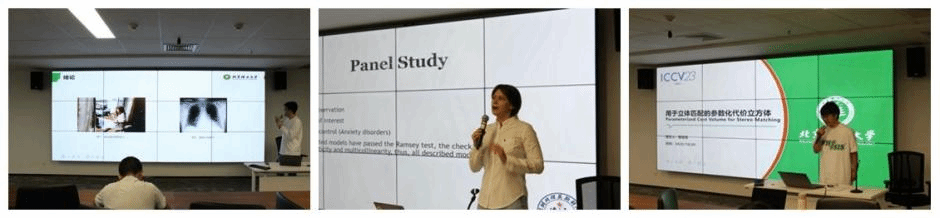 在下午的论坛中,沈雨欣同学介绍了眼动数据在人认知过程中的作用。沈洪宇同学从生成高质量医疗报告的现存挑战出发,提出了一种基于记忆矩阵图文匹配的医疗报告生成方法。田孟潇同学指出图文匹配任务中存在图像和文本不相关实体对匹配过程的干扰,并提升了模型的语义对齐和分布对齐性能。Iaroslava Pravolamskaya介绍了对不同国家人群抑郁症、焦虑症的调查研究工作,指出国家可以通过救济失业人群减轻国民患病的风险。刘恩齐同学介绍了一种事件相机数据预训练,使得事件相机图像可以与RGB图像特征对齐的方法,提升了模型迁移能力。曾嘉禧同学介绍了立体匹配任务及将参数化代价立方体应用于立体匹配任务,提高了匹配的效率。李川皓同学介绍了基元的概念,并在工作中探索了视觉和语言的基元对组合泛化的影响,有效提高模型的学习能力。