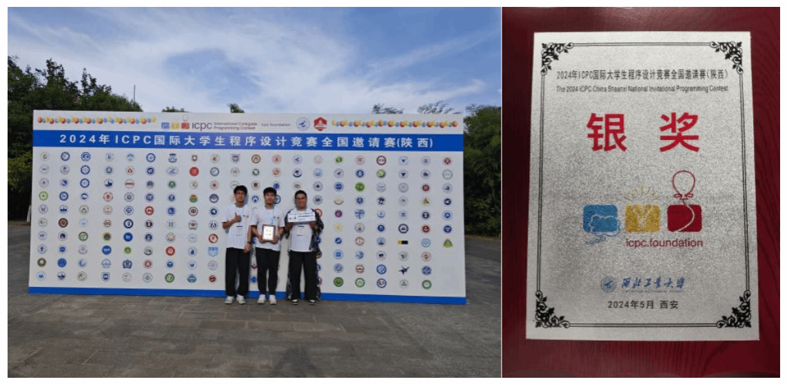 在ICPC西安邀请赛中,由2023级数学与应用数学专业级王司晨、2023级电子与计算机工程专业杨熠鑫、徐健皓组成的队伍获得银奖。在ICPC武汉邀请赛中,由2023级数学与应用数学专业王司晨、电子与计算机工程专业杨熠鑫、金融科技专业赵欣语组成的队伍获得铜奖。