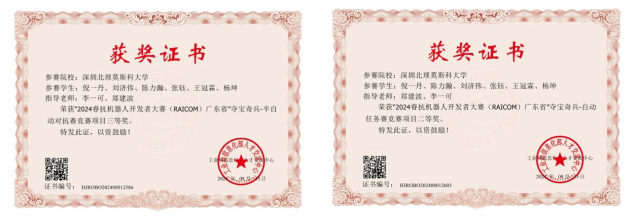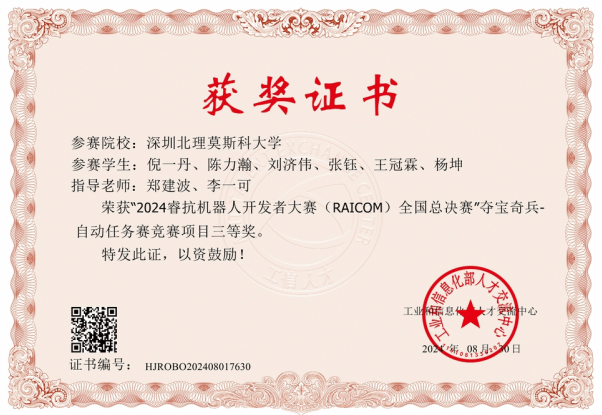 大赛自启动以来,共吸引了来自全国100余所高校的3万余名师生参赛,包括华中科技大学、国防科技大学、吉林大学等在内的众多国内知名高校参赛,赛事竞争激烈、水平极高。经过各赛区的激烈角逐后,最终有100多支队伍晋级全国总决赛。其中,由我校工程系本科生倪一丹、刘济伟、陈力瀚、张钰、王冠霖、杨坤组成的参赛队获得全国总决赛夺宝奇兵-自动任务赛竞赛项目三等奖。同时,也获得了广东省夺宝奇兵-半自动对抗赛竞赛项目三等奖,夺宝奇兵-自动任务赛竞赛项目二等奖。