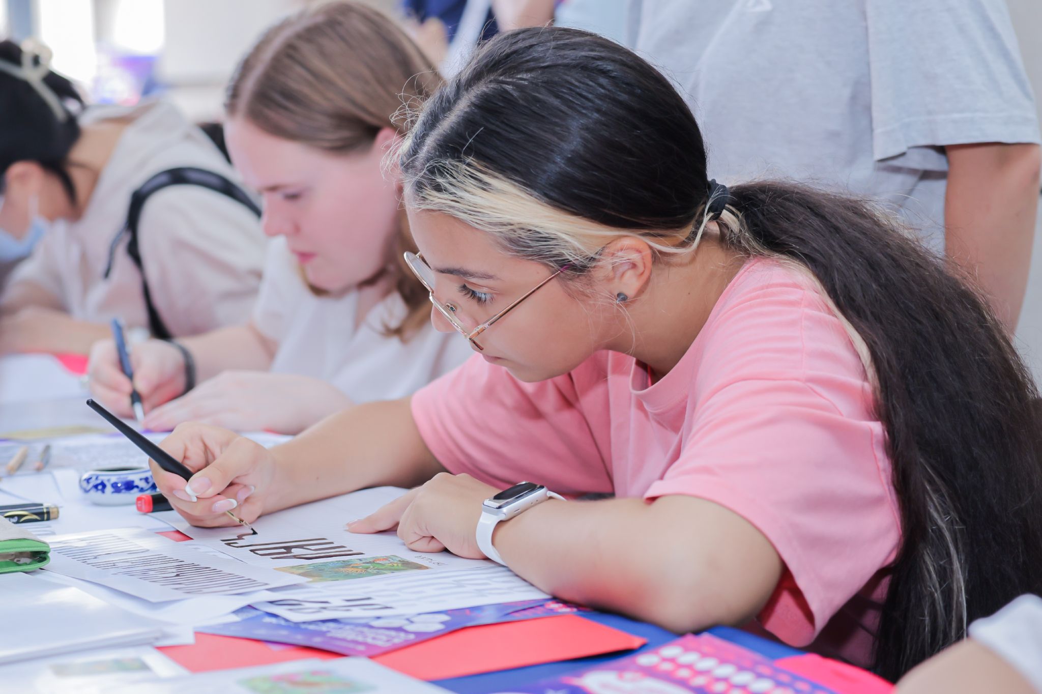 随后,在书法体验课上,大家还参加了有趣的知识问答游戏。游戏中的问题涉及多角字体、简化多角字体、草书、连字这些书写技巧。体验课的参与者特别喜欢《连字》的书写技巧。连字在历史上与其说是文字,更像是漂亮的字形字谜,经常被用做图案装饰,如被连字为《中国》一词。学生们很快就猜出了所有谜底,并获得了甜品奖励。他们还得到了用于留念的手写草书祝福卡。