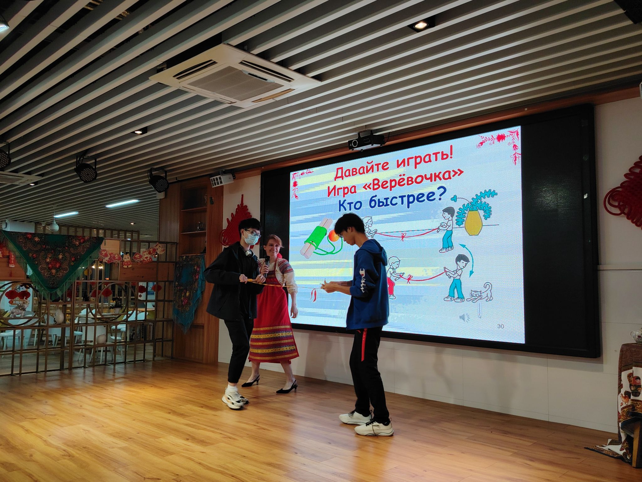 活动现场举行了许多比赛和游戏:说出关于“谢肉节”的俄语谚语和俗语、卷“绳子”游戏(谁更快地把绳子卷到木棒上)、抢“帽子”游戏(谁更快地摘下对手头上的帽子)、“新郎”(谁能在跳舞时机智地从女孩手中抢到手帕),以及拼单词游戏(两个队从所给的字母中快速拼出与谢肉节相关的单词)等。