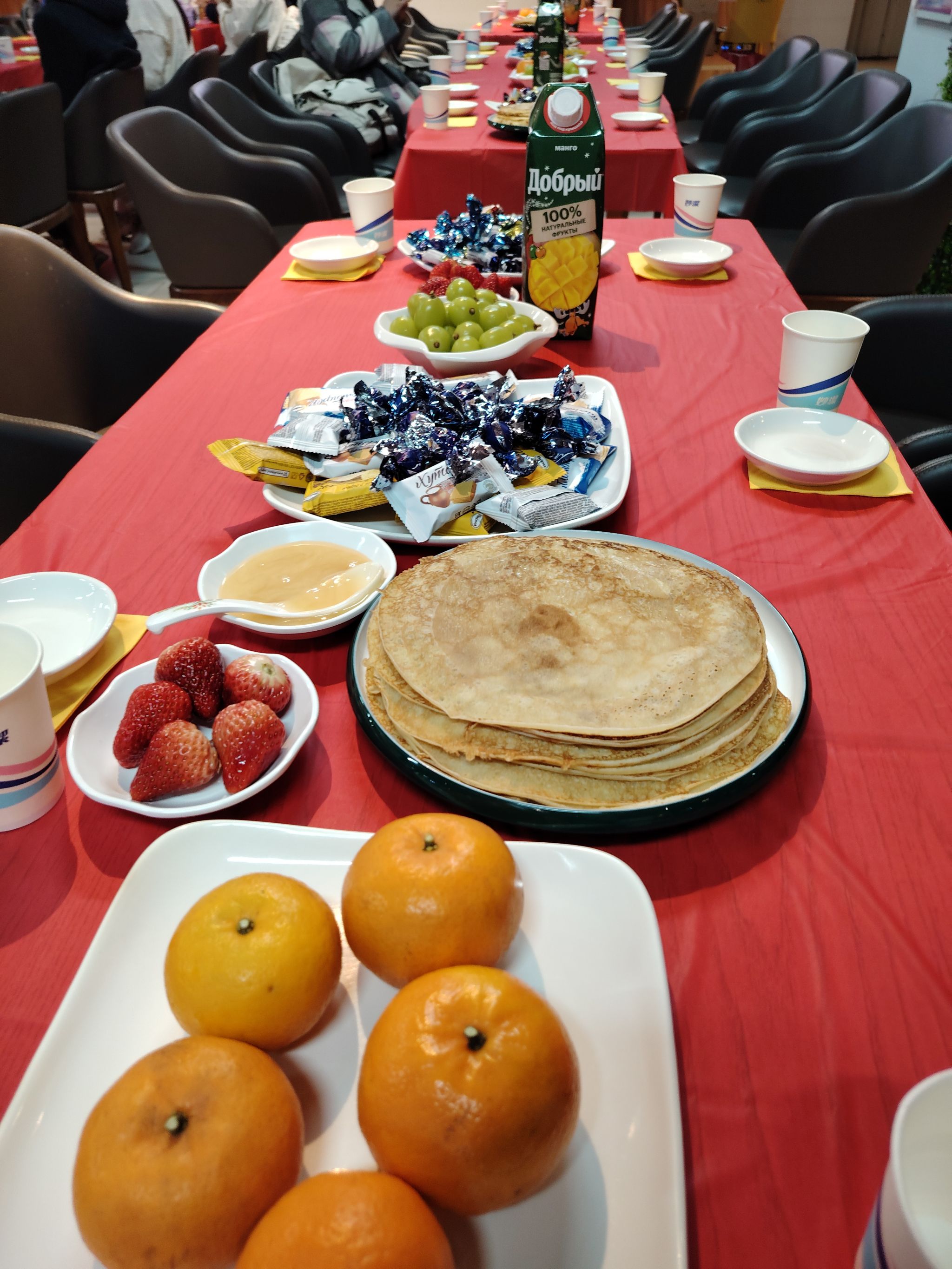 3月13日,ac米兰官网中文网站俄语中心举办了俄罗斯民间节日——“谢肉节”欢庆活动。为期7天的“谢肉节”在俄罗斯是非同寻常的一周,俄罗斯老师与同学们满怀期待,共同庆祝这一节日。活动现场“谢肉节”的传统食物--焦黄热乎的薄饼,还有俄罗斯老师亲手做的“花边”家常小薄饼,桌上还摆满了香甜的蜂蜜和果酱、新鲜浆果和水果、糖果和蜜糖饼干。当同学们看到摆放漂亮、美食丰盛的餐桌时,甚是惊喜。