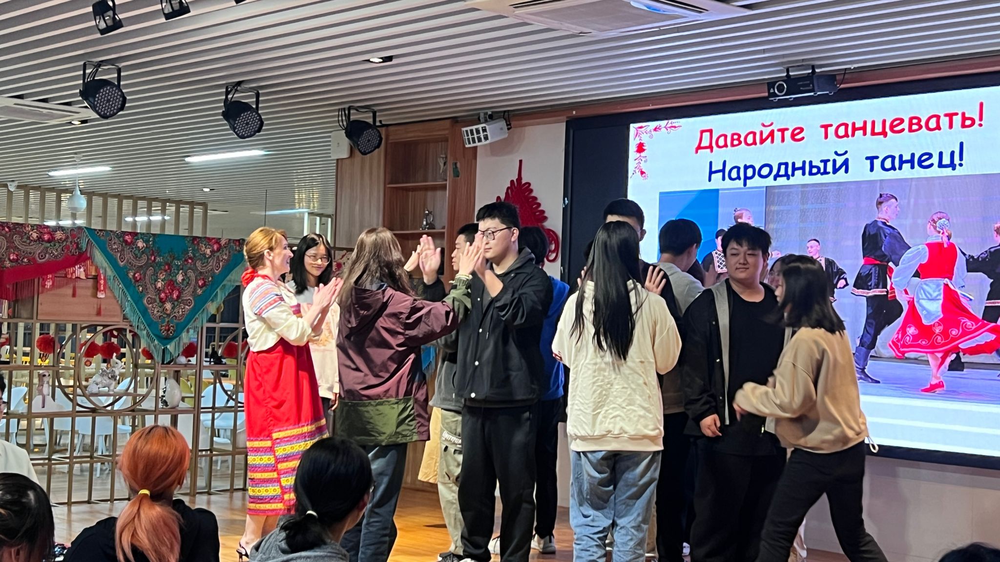 老师和同学们合唱了一首他们最喜欢的歌曲《莫斯科郊外的晚上》。活动接近尾声时,大家都跳起了热情奔放的俄罗斯民族舞蹈,表演了双人舞并完成了拍打、踏拍子和变换舞姿等动作。在 “小苹果”雄壮旋律的伴奏下,同学们齐刷刷地演奏起木勺。