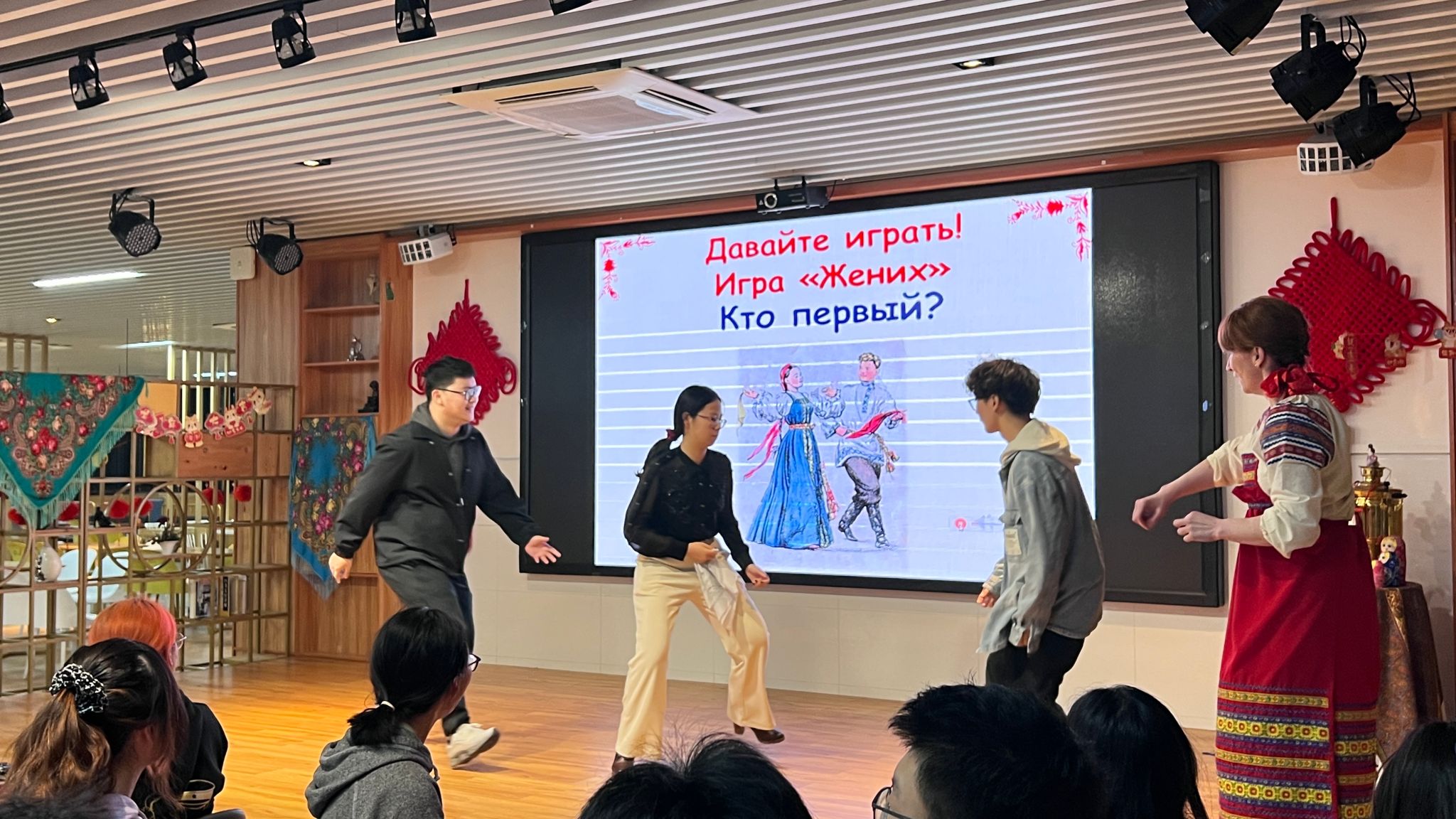 本次活动的主要目的是让同学们了解“谢肉节”的传统习俗。活动现场的舞台一侧挂着俄罗斯披肩,主持人身着俄罗斯民族服装,餐桌上准备了丰富的俄罗斯茶炊。主持人首先向同学们介绍了“谢肉节”的历史来源和意义:“谢肉节”的象征是太阳,节日的意义是迎接春天。同时还讲述了“谢肉节”的习俗,比如,星期一被称为“迎春日”,这一天人们制作谢肉节稻草人;星期二开始举行一系列有趣的比赛;星期三通常会串门做客;星期四被称为“狂欢日”,这一天将会举办盛大的活动,如“爬冰柱”“墙对墙”(众人拳击)等。通过主持人的讲述,色彩鲜明的PPT展示及其靓丽的照片、民乐和有趣的视频片段,同学们获得了许多“谢肉节”的民俗知识,餐桌上的美味佳肴也给同学们留下了深刻的印象。