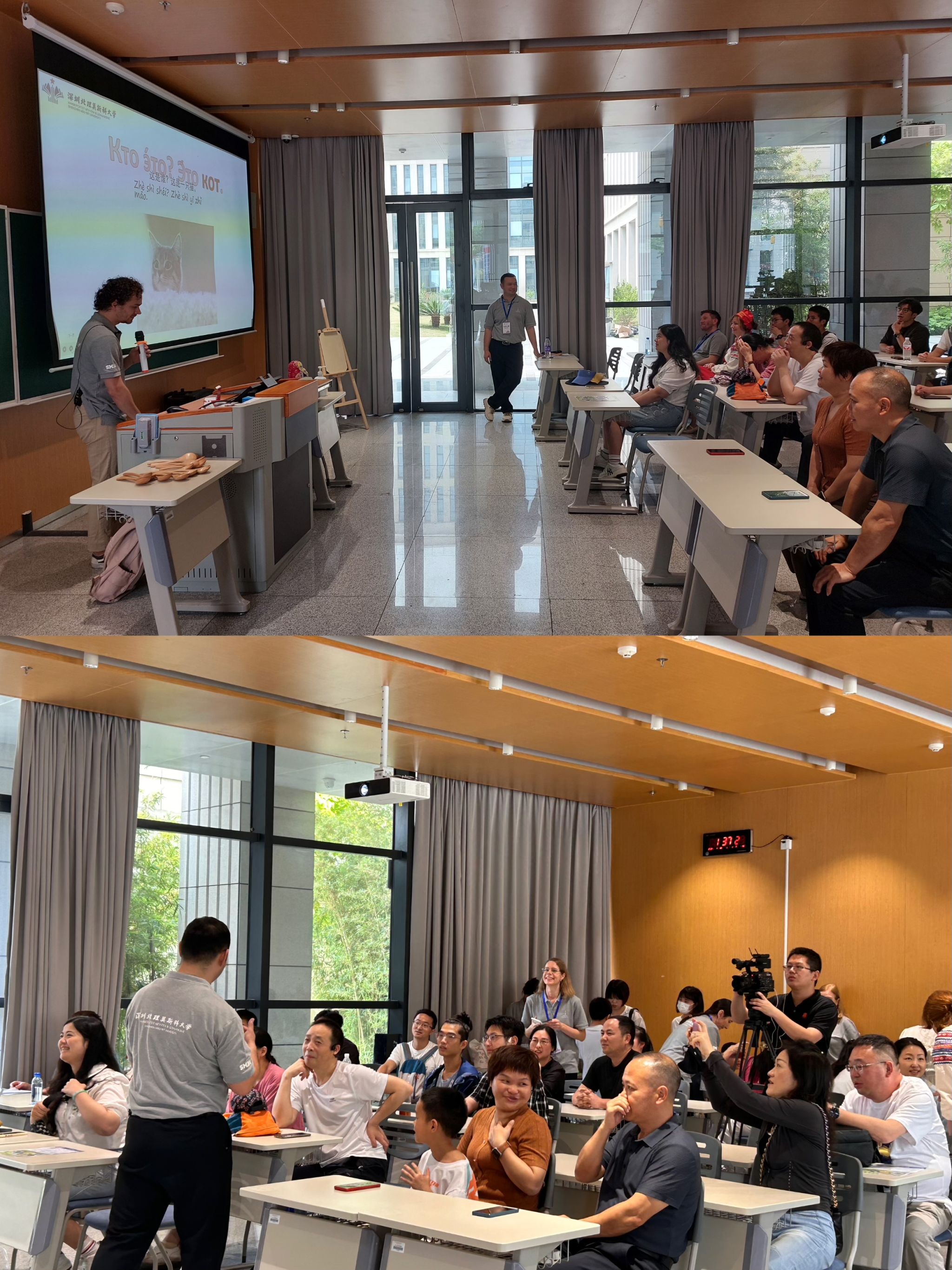 您可能会问:“怎么光讲理论,没有实践呢?”当然,我们的活动中少不了课堂展示。这个环节由俄方教师塔拉索夫主讲,俄语中心其他同事给予协助。此时,展台变成了教室,听众变成了学生,他们积极回答有趣好玩的提问。来自ac米兰不同专业的一、二、三年级的学生主动帮助这些新 “同学”学习俄语,并在“课堂”结束后愉快地解答考生家长感兴趣的学校生活和学习方面的问题。课程结束后,这些考生家长高兴地用俄语与教师们打招呼和告别!