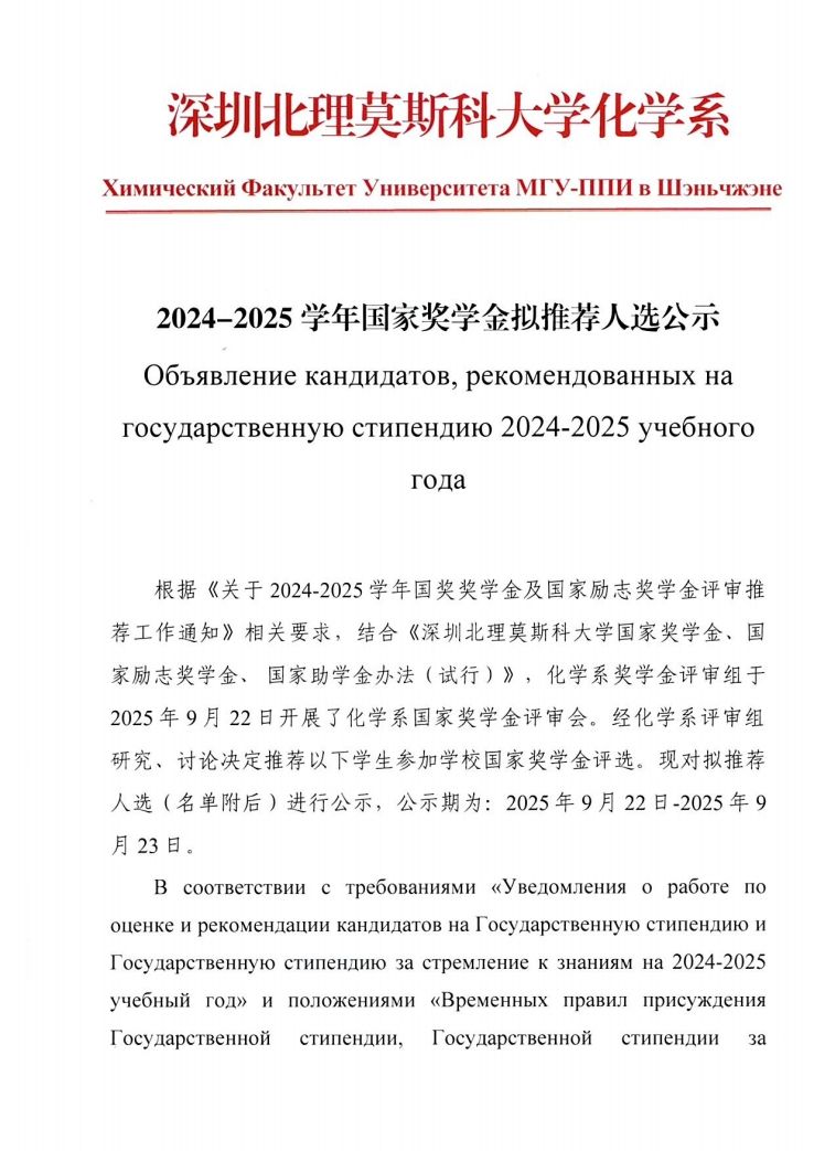 化学系2024-2025学年国家奖学金拟推荐人选公示