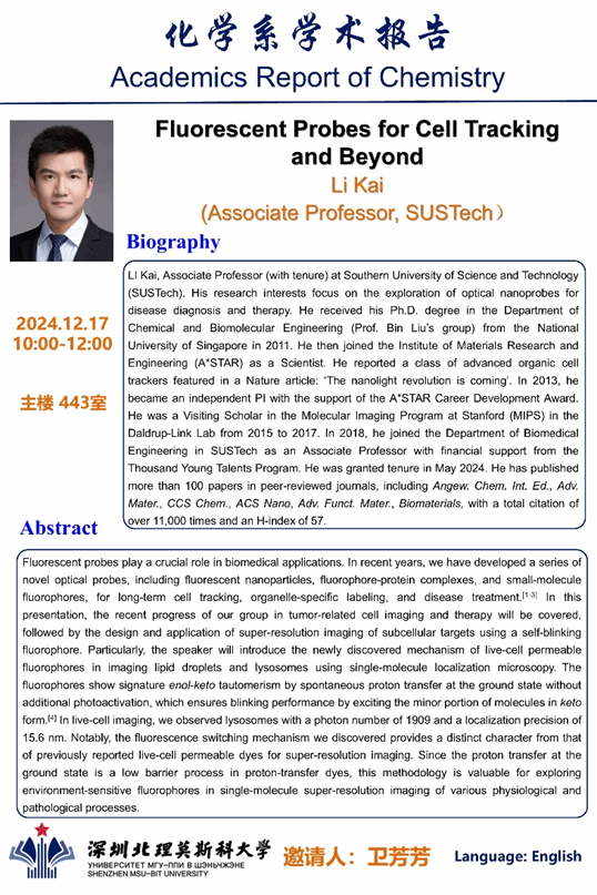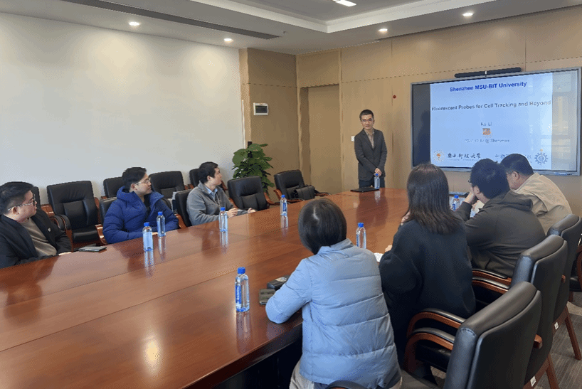 2024 年 12 月 17 日上午,在ac米兰主楼会议室,南方科技大学生物医学工程系的李凯副教授带来了题为 “Fluorescent Probes for Cell Tracking and Beyond” 的学术报告,吸引了化学系和材料科学系教师的积极参与,现场学术氛围浓厚,交流互动热烈。