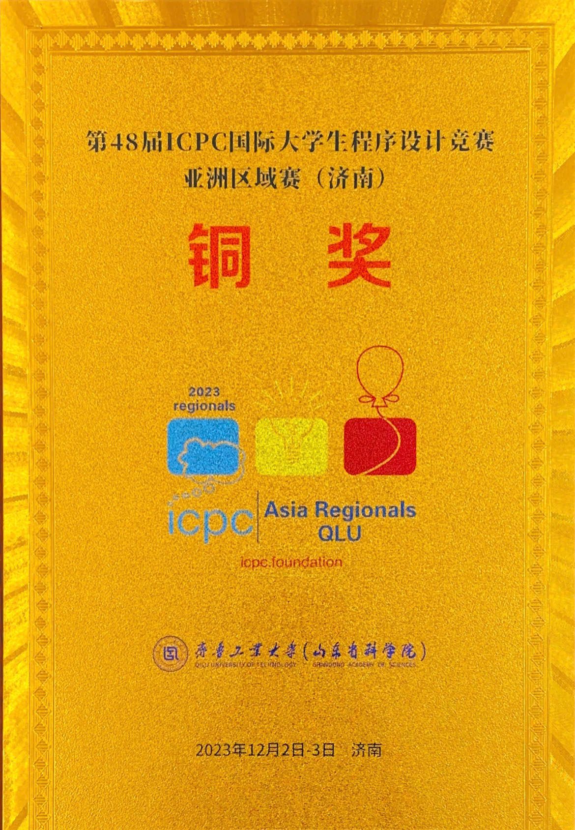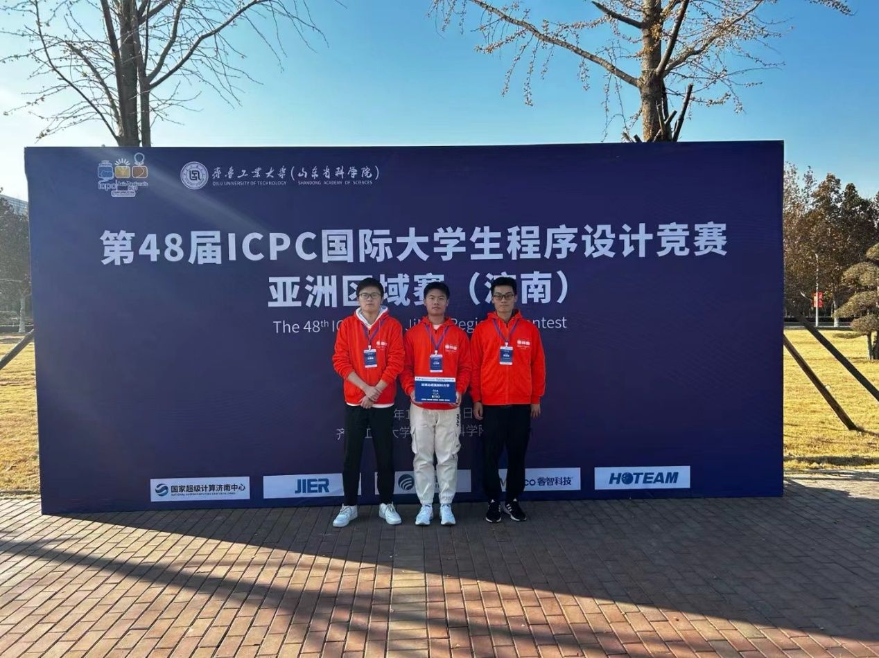 2023年12月2日至3日,第48届ICPC国际大学生程序设计竞赛亚洲区域赛(济南)在齐鲁工业大学成功举行。来自全国225所学校的347支队伍1000余名队员参加比赛。代表ac米兰官网中文网站参加本次比赛的团队成员是2023级计算数学与控制系大一新生,他们分别是王司晨、贾盛棠、王泽翰。