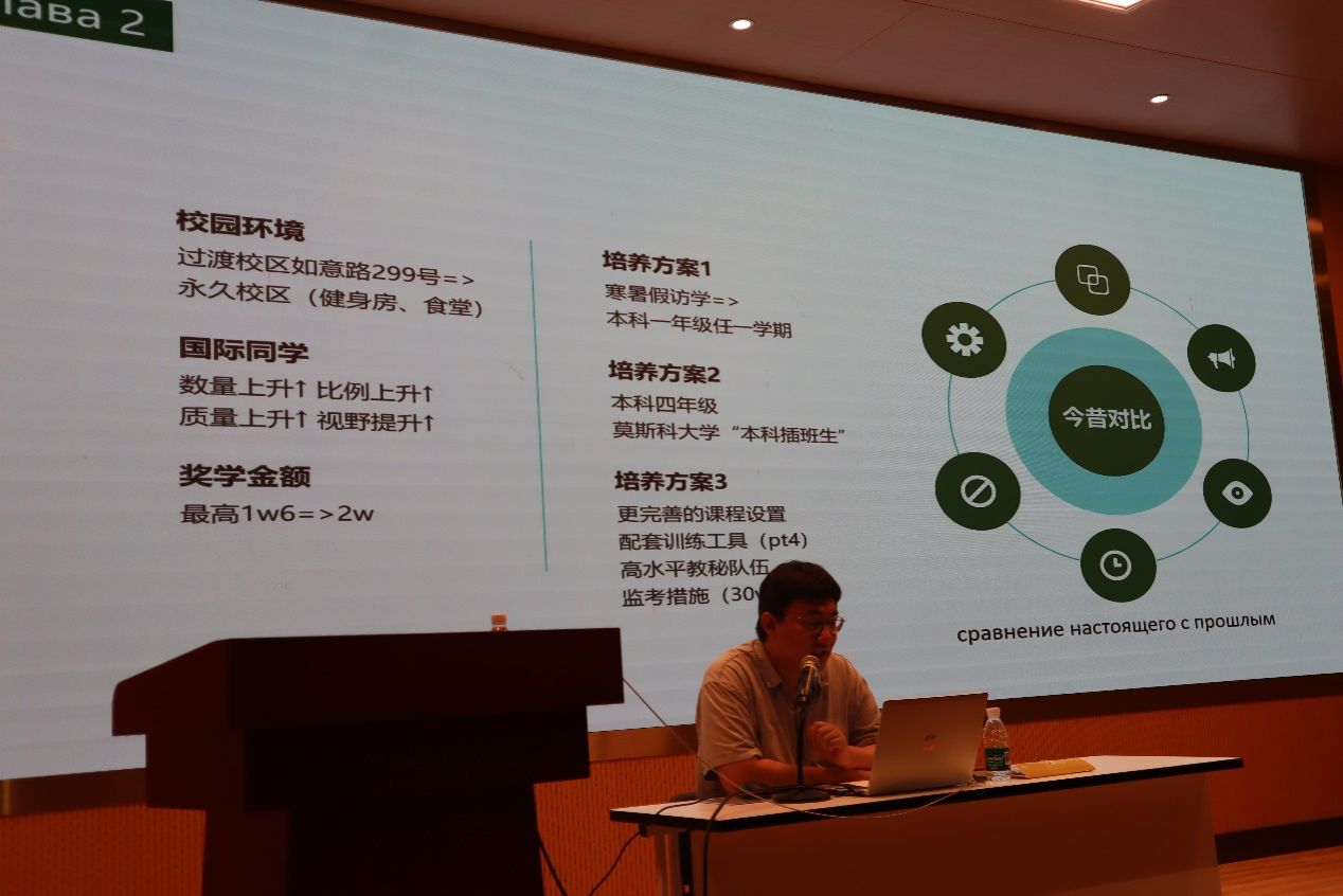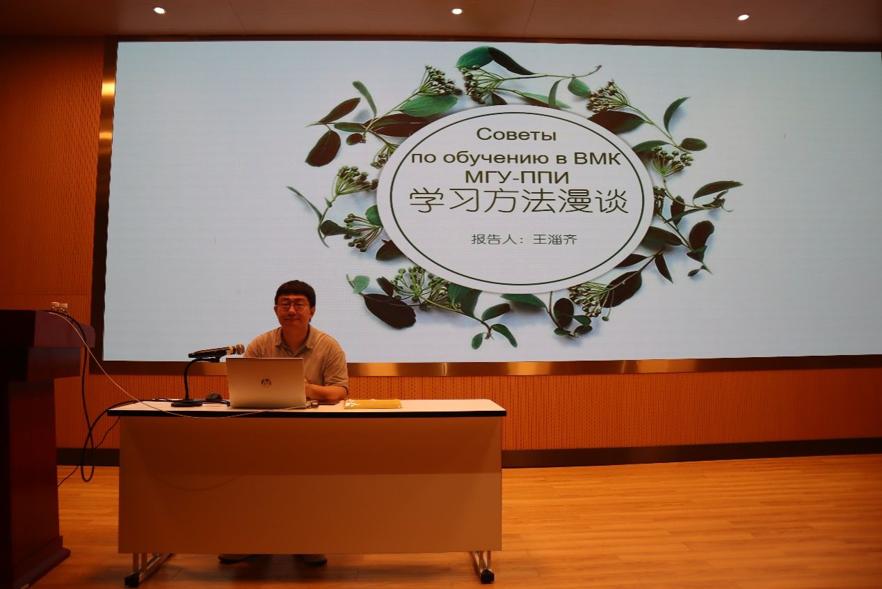 在分享学习经验时,王淄齐博士从“回顾过去”、“把握现在”和“展望未来”三个维度展开。他用今昔对比的方式就学校硬件环境和软科建设等方面的发展变化进行回顾,指出校园设施、奖学金额度、国际学生比例及培养方案等方面都在明显优化,鼓励新生珍惜大学一年级前往莫斯科进修的机会,为后续的俄语专业课学习打下坚实基础。同时,他强调了利用学校完善的课程设置和训练工具,提升数学和编程能力的重要性。