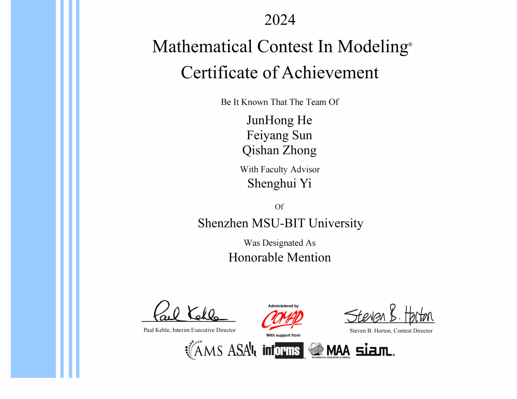 ac米兰官网中文网站2024美国大学生数学建模竞赛经济系获奖名单及奖状