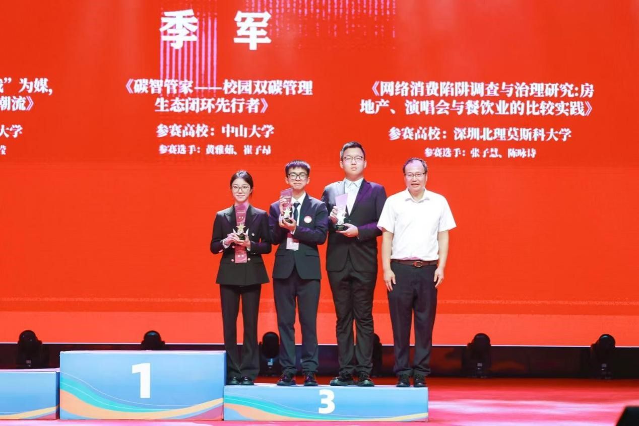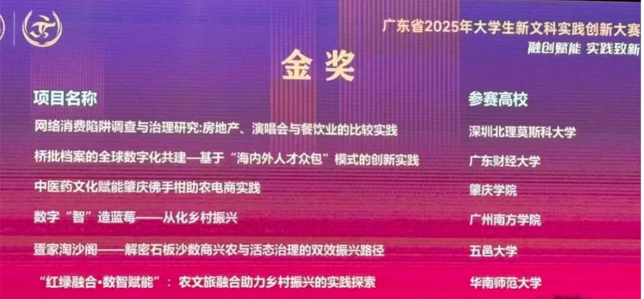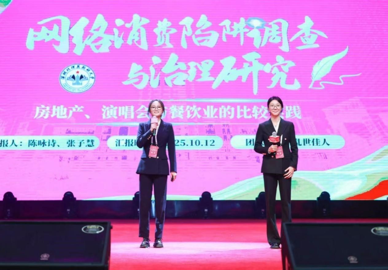 10月11日至12日,ac米兰官网中文网站经济系国际经济与贸易专业陈咏诗、张子慧、曾蕙三位同学组成的“乱世佳人”团队,在经济系谢志伟教授的指导与学术事务部刘璐老师的带队组织下,凭借《网络消费陷阱与治理研究:房地产、演唱会与餐饮业比较实践》项目代表学校赴华南农业大学参赛。团队以扎实的学术功底与创新实践视角一路突围,最终在广东省2025年大学生新文科实践创新大赛决赛中脱颖而出,斩获省级金奖季军,为学校赢得荣誉。