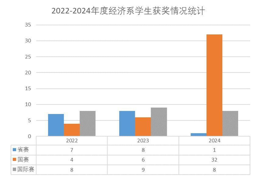 经济系非常重视科研、创新创业及学科竞赛,超过50%的学生参与了活动。在学生培养成效方面,学生获国际级奖项8项、国家级奖项32项,省市级奖项1项。