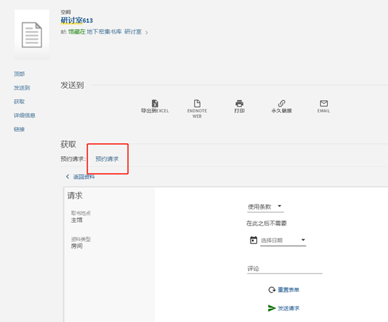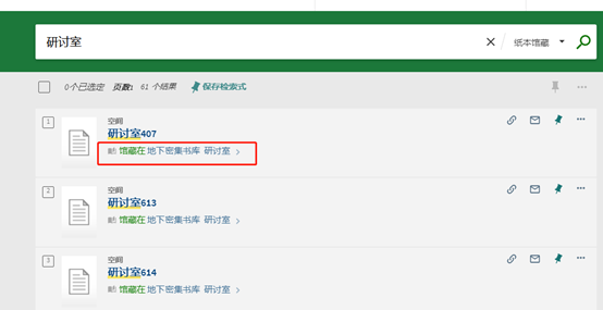 (3)在检索框输入“研修室”或“研讨室”进行检索。(研修室可预约时间为1天,当天闭馆前须归还;研讨室可预约时间为4小时,研讨室可供2人以上使用)