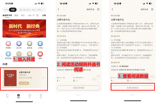 进入书城首页,找到共读活动专区,点击“加入共读”后阅读指定书籍即可。