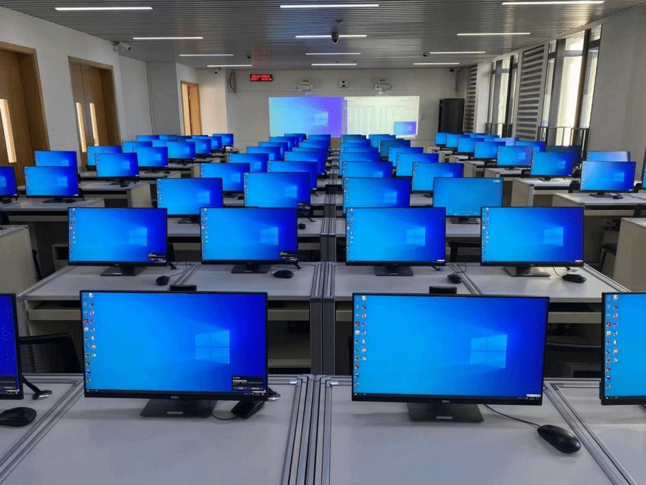计算机教学实验室设于2号实验楼五层(2间),每间教室面积约140㎡,共计配备164个机位。该教学系统采用先进的“一体化集成智能交互讲台+两台超短焦高清互动投影双拼”,可在5纳米书写墙上做交互显示,实现“实体白板+电子白板”多功能。在扩声系统上使用数字红外辅助教学扩声,实现 “一师一麦” 配置,实践未来教学新方向。教室配置自动升降课桌椅、考场监控系统,可以满足各类考试使用。配置中控系统、AI录播系统、桌面集中管理平台、专业图形工作站等硬件,数据库、DEV C++,mysql、python等软件。