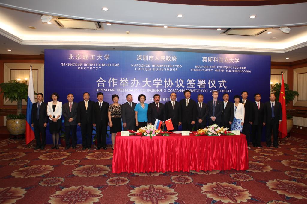 国务院总理李克强与俄罗斯总理梅德韦杰夫在圣彼得堡共同签署《中俄总理第二十一次定期会晤联合公报》明确:继续推动并确保北京理工大学和莫斯科国立大学在深圳合办的中俄联合大学早日建成。