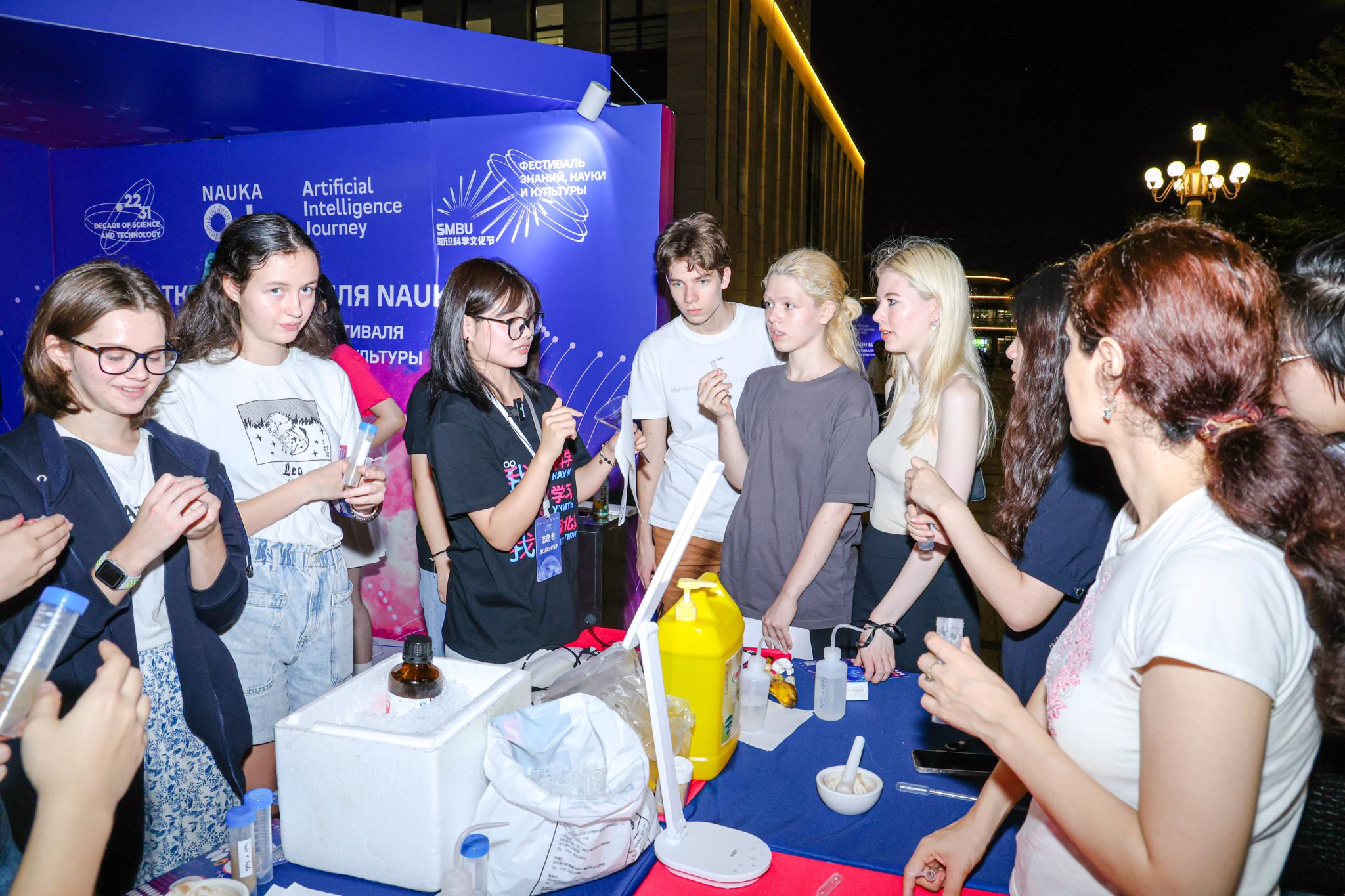 从水果中提取DNA、裸眼观察DNA分子、猜测在一个水族箱中有多少种物种能够平和地共存……在星光下的校园中心广场上,多场主题新颖、趣味十足的生物大师班,正迎着晚风火热地展开。参与者们围站在大师班区域的四周,一些隐匿在生活中不易被发现的“生命秘密”在夜幕中逐渐揭开。