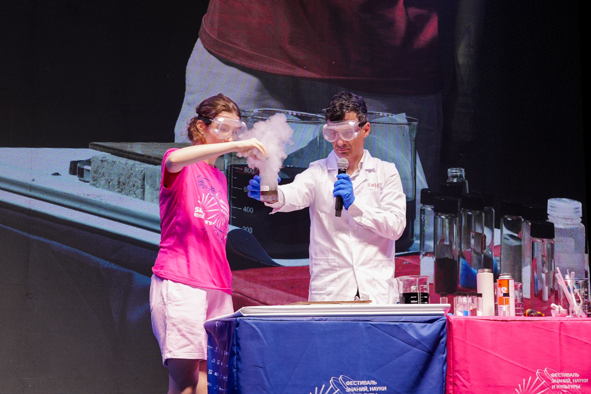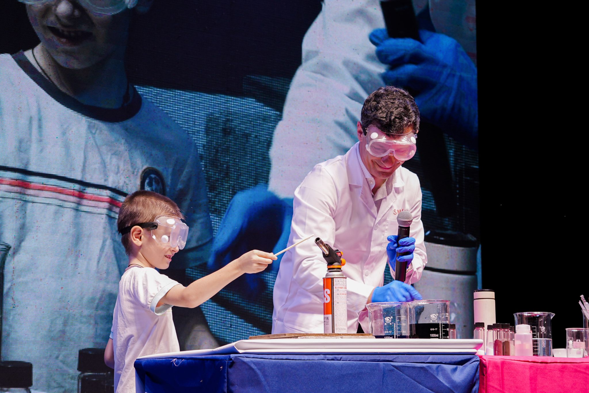 取少量镁粉,用火焰枪点燃,轻轻一吹,剧烈的燃烧发出了耀眼的白光……除了主题讲座,阿尔乔姆·奥加诺夫还带来了一场科学秀——《化学如何解释世界》,这场科学秀的实验内容来源于他所编写的科普书籍。“为什么人的血液和砖是红色的?”“火焰的颜色是什么?”“燃烧、氧化、催化效应分别是什么现象?” ……有趣的问题、神奇的化学反应,让这场科学秀“含娃量”极高,被科学“迷倒”的孩子和学生们争先恐后举手,想要成为阿尔乔姆·奥加诺夫的实验助手,上台动手体验。试管、烧杯、火焰枪······阿尔乔姆·奥加诺夫利用各种实验道具,将抽象枯燥的科学原理变得生动有趣,紧紧抓住了在场观众的注意力。
