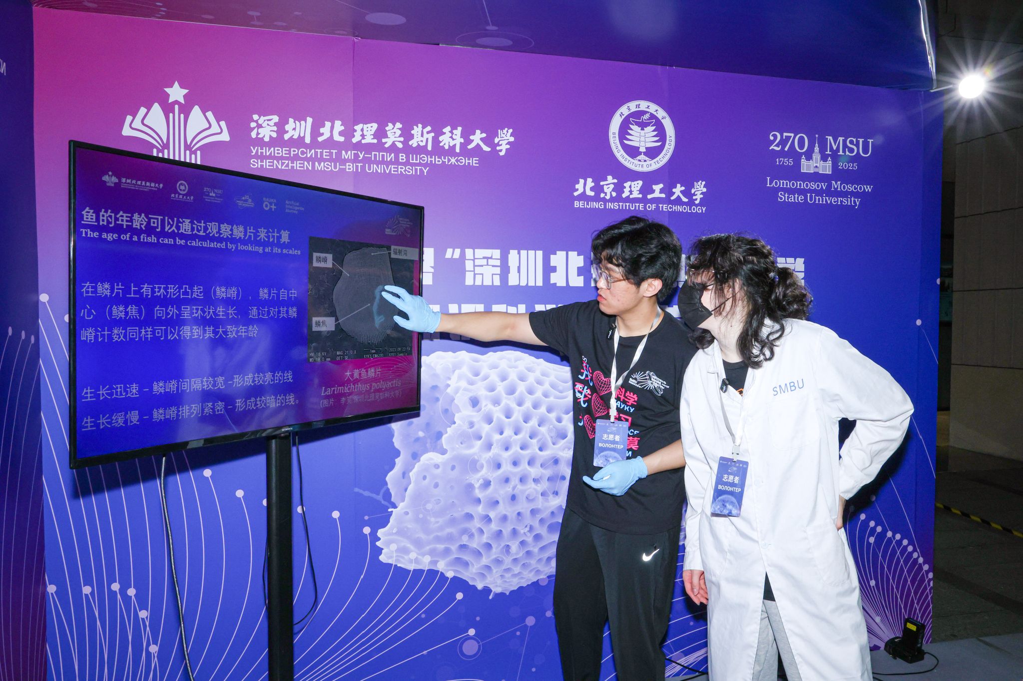 “鱼的年龄测定”生物大师班的课堂中,桌上横放着的两条鱼,吸引了许多学生的驻足。“像这样用镊子把鱼鳞夹出来,在培养皿里把黏液扫清,放入玻片,就可以开始观察了。”学生们在导师的指导下戴着实验手套,小心地处理鱼鳞,通过现场的讲解,用显微镜观察估测鱼的年龄,现场惊呼不断,氛围高涨。