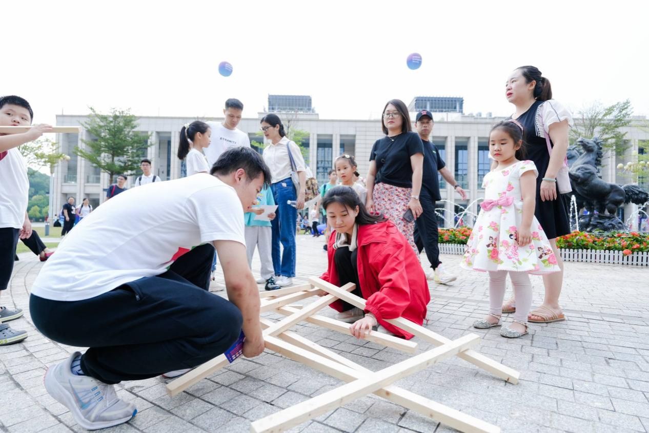 “先放一根横着的木棍,再把这根搭在这里,然后……”广场的另一边,六年级的赖同学嘴里念念有词,正专心致志地挑战“达芬奇桥”搭建。不需要钉子和胶水就能够搭建出来,并且十分坚固的“达芬奇桥”,让现场的参与者们啧啧称奇并跃跃欲试。“我一直都对物理很感兴趣,‘达芬奇桥’我之前就听说过。”仅仅只是看了一遍志愿者的示范,便挑战成功的赖同学认为这次开放周的活动都非常好玩,亲身参与到物理实验中,也让他更坚定了心中对物理的热爱。