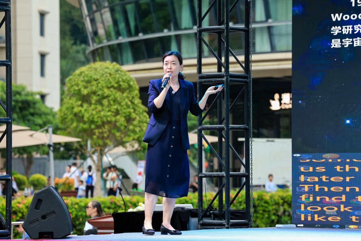 接着,姚蕊讲述了深空探索的历史和FAST的建设历程,展示了FAST在建造和运行过程中取得的亮眼科技成就。她生动介绍了FAST总工程师南仁东先生带领团队执着奉献、攻坚克难的科学家事迹,深入浅出地带领公众学习深空科学知识,理解深空探索事业。
