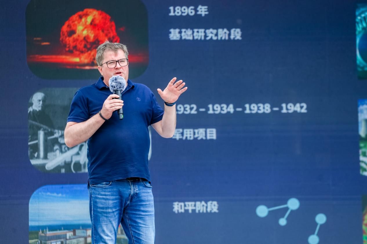 卡尔梅科夫指出,人类接触到的辐射绝大多数源自自然界,而由人为因素如核试验和泄漏造成的辐射仅占3%-5%。他强调,放射线在医疗领域的应用,尤其是核医学,已经成为对抗癌症的关键工具。他带领现场观众回顾了放射性化学的发展历程,从早期的基础研究,经过军事应用阶段,到现在的和平利用,特别是在核医学领域的应用。卡尔梅科夫介绍了几种放射性元素在医学诊断与治疗中的应用案例,并深入解析了放射性定向治疗的机制,特别提到了其团队正在研究的新型放射性分子BI-213-DOTATOC在肿瘤治疗方面的潜力。