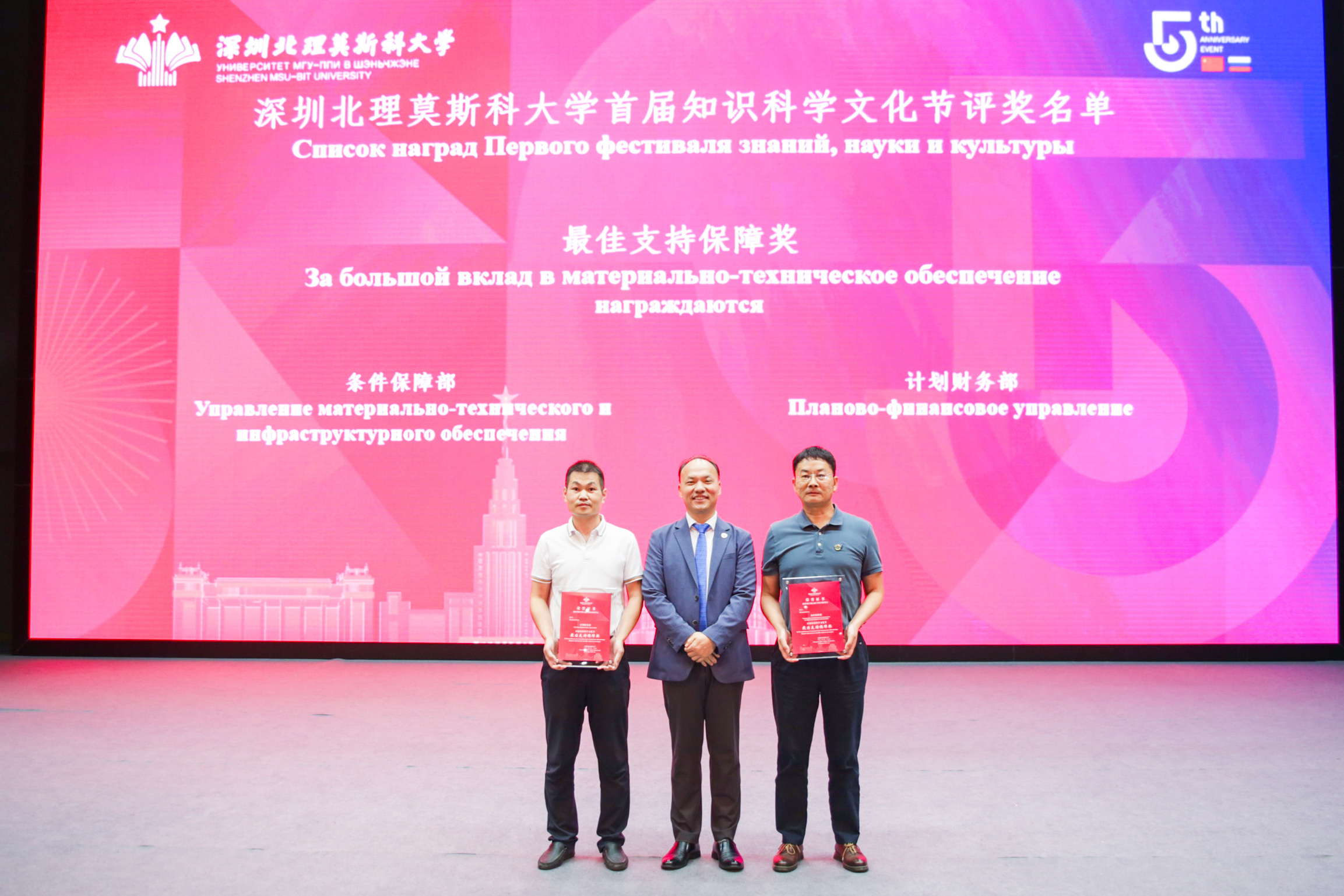 为表彰学校各部门在首届知识科学文化节中的突出表现。李和章为学校办公室、材料科学系、语言系、图书馆、艺术中心等五个单位颁发“突出贡献奖”;沙赫赖和陈超峰为计算数学与控制系、生物系、工程系、经济系、中俄法学比较研究中心、俄语中心、汉语中心、英语中心、组织人力资源部、学生工作部、国际学术交流合作部等十一个单位颁发“优秀组织奖”;朱迪俭为条件保障部、计划财务部颁发“最佳支持保障奖”。