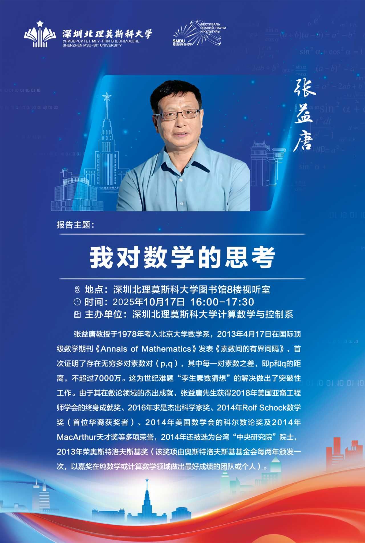 主讲人简介:张益唐教授于1978年考入北京大学数学系,2013年4月17日在国际顶级数学期刊《Annals of Mathematics》发表《素数间的有界间隔》,首次证明了存在无穷多对素数对(p,q),其中每一对素数之差,即p和q的距离,不超过7000万。这为世纪难题“李生素数猜想”的解决做出了突破性工作。由于其在数论领域的杰出成就,张益唐先生获得2018年美国亚裔工程师学会的终身成就奖、2016年求是杰出科学家奖、2014年Rolf Schock数学奖(首位华裔获奖者)、2014年美国数学会的科尔数论奖及2014年MacArthur天才奖等多项荣誉,2014年还被选为台湾“中央研究院”院士2013年荣奥斯特洛夫斯基奖(该奖项由奥斯特洛夫斯基基金会每两年颁发次,以嘉奖在纯数学或计算数学领域做出最好成绩的团队或个人)